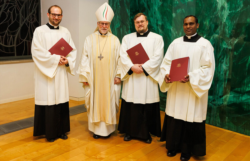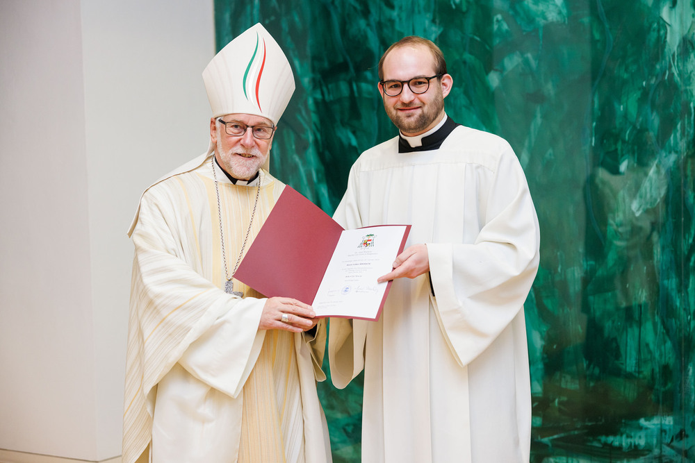 Ajayan Joseph, für die Diözese Punalur (Indien), und Lukas Krobath aus der Pfarre St-Theresia, empfingen die Beauftragung zum Akolythen. Neben der Assistenz in der Messe sind Akolythen zum Dienst des Aussetzens des Allerheiligsten für die eucharistische Anbetung und das Bringen der Kommunion zu den Kranken und Alten bestellt. Bischof Marketz betonte, dass es wichtig ist diesen Dienst mit der Gemeinde zu verrichten und dass wir durch unsere Tätigkeit weitere Gläubige dazu ermutigen und befähigen sollten, sich in den Akolythendienst stellen zu lassen. Denn die Eucharistie ist, wie es das 2. Vatikanische Konzil formuliert: „Quelle und Höhepunkt des christlichen Lebens“ (Lumen Gentium 11).