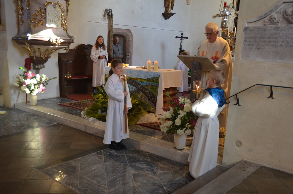 Bei der Allerheiligenlitanei wurden die Heiligen unserer Filialkirche angerufen, wobei die Ministranten auf ihr Bild dabei zeigten.